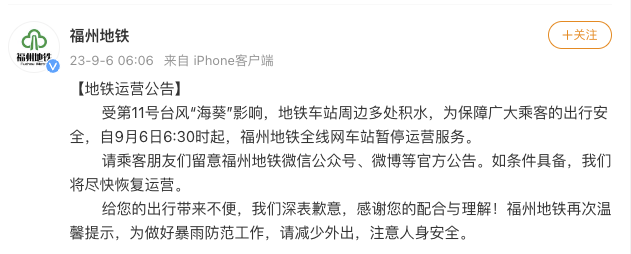 央視網(wǎng)消息:據(jù)@福州地鐵 微博消息,受第11號臺風(fēng)“海葵”影響,地鐵車站周邊多處積水,為保障廣大乘客的出行安全,自9月6日6:30時(shí)起,福州地鐵全線網(wǎng)車站暫停運(yùn)營服務(wù)。如條件具備,將盡快恢復(fù)運(yùn)營。