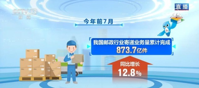 央視網(wǎng)消息:今年前7月,我國(guó)郵政行業(yè)寄遞業(yè)務(wù)量累計(jì)完成873.7億件,同比增長(zhǎng)12.8%。其中,快遞業(yè)務(wù)量累計(jì)完成703億件,同比增長(zhǎng)15.5%;國(guó)際/港澳臺(tái)快遞業(yè)務(wù)量累計(jì)完成16.1億件,同比增長(zhǎng)57.2%。