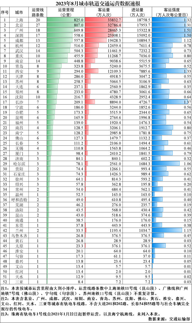 央視網(wǎng)消息:交通運(yùn)輸部發(fā)布2023年8月城市軌道交通運(yùn)營數(shù)據(jù)速報(bào),2023年8月,31個?。ㄗ灾螀^(qū)、直轄市)和新疆生產(chǎn)建設(shè)兵團(tuán)共有54個城市開通運(yùn)營城市軌道交通線路297條,運(yùn)營里程9771.8公里,實(shí)際開行列車325萬列次,完成客運(yùn)量27.1億人次,進(jìn)站量16.3億人次。8月份,客運(yùn)量環(huán)比增加0.4億人次、增長1.7%,同比增加7.5億人次、增長38.4%,較2019年月均客運(yùn)量增加7.2億人次、增長36.0%。8月份客運(yùn)強(qiáng)度平均水平為0.556萬人次每公里日,較2019年全年客運(yùn)強(qiáng)度平均水平增長1.9%。
