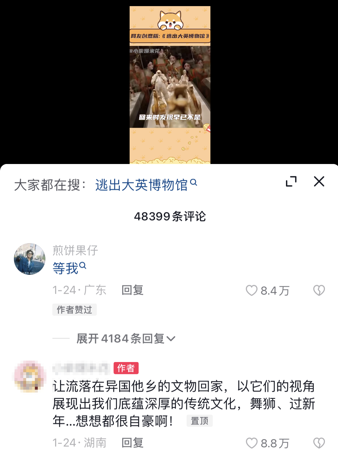 這仿佛巧合般的存在,實則藏著一條文化接力的暗線。2023年初,一名網(wǎng)友自制短視頻,提出了《逃出大英博物館》的創(chuàng)意想法:“讓流落在異國他鄉(xiāng)的文物回家,以它們的視角展現(xiàn)出我們底蘊(yùn)深厚的傳統(tǒng)文化?!彼⒌揭曨l的煎餅果仔在評論區(qū)留下了兩個字“等我”。