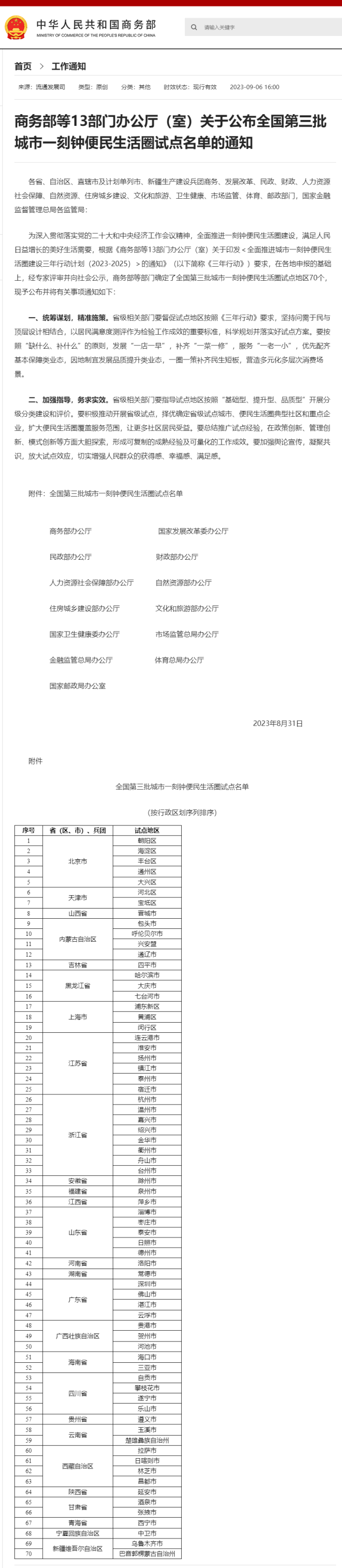 為深入貫徹落實黨的二十大和中央經濟工作會議精神,全面推進一刻鐘便民生活圈建設,滿足人民日益增長的美好生活需要,根據(jù)《商務部等13部門辦公廳(室)關于印發(fā)<全面推進城市一刻鐘便民生活圈建設三年行動計劃(2023-2025)>的通知》(以下簡稱《三年行動》)要求,在各地申報的基礎上,經專家評審并向社會公示,商務部等部門確定了全國第三批城市一刻鐘便民生活圈試點地區(qū)70個,現(xiàn)予公布并將有關事項通知如下: