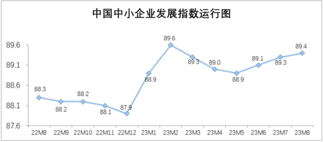 8月中國中小企業(yè)發(fā)展指數(shù)為89.4,比7月上升0.1點(diǎn),這是繼6月、7月分別上升0.2點(diǎn)之后,連續(xù)第三個月上升。