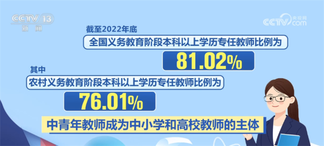 近年來,“特崗計劃”、“三區(qū)”人才支持計劃教師專項計劃等源源不斷地為鄉(xiāng)村學校補充高素質(zhì)教師。優(yōu)師計劃、師范教育協(xié)同提質(zhì)計劃、國優(yōu)計劃等的實施,也在助力優(yōu)秀教師的培養(yǎng)。我國各級各類教師隊伍學歷不斷提高、年齡結(jié)構(gòu)不斷優(yōu)化。截至2022年底,全國義務(wù)教育階段本科以上學歷專任教師比例為81.02%,其中,農(nóng)村義務(wù)教育階段本科以上學歷專任教師比例為76.01%,中青年教師成為中小學和高校教師的主體。
