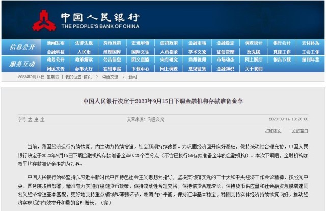央行決定9月15日下調金融機構存款準備金率0.25個百分點
