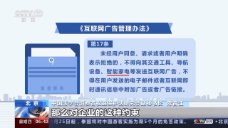 中國法學(xué)會消費(fèi)者權(quán)益保護(hù)法研究會副秘書長 陳音江:廣告法里面規(guī)定得就比較粗一些,任何單位或個(gè)人,你沒有經(jīng)過當(dāng)事人的同意,不能夠向這種住宅或者說交通設(shè)施上去投放廣告,但是用的是“等”,就沒有這么具體。修訂實(shí)施的《互聯(lián)網(wǎng)廣告管理辦法》里面,它就明確地說了包括智能家電,你沒有經(jīng)過同意,你也不能夠往它里面去發(fā)送這種廣告。這幾年,針對智能家電的這種廣告它的規(guī)定越來越具體,那么對企業(yè)的這種約束也應(yīng)該是越來越具體,或者說它這種合規(guī)的紅線越來越明確。