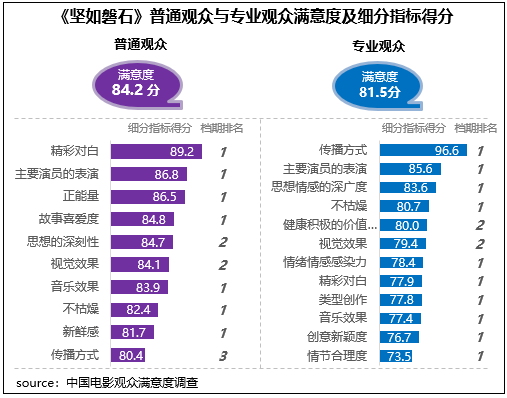 張藝謀導(dǎo)演新作《堅(jiān)如磐石》獲得觀眾滿意度評(píng)分84.1分,居2023年國(guó)慶檔調(diào)查五部影片首位,作為聚焦反腐反黑的警匪題材影片,對(duì)于社會(huì)現(xiàn)實(shí)以及人性的描摹深度和豐富層次得到了觀眾的高度好評(píng),思想性得分85.4分,為三大指數(shù)中最高,觀賞性得分84.4分,為檔期最高分,其中主要演員的表演得到了不同觀眾的高度評(píng)價(jià),在2023年調(diào)查的50部影片中分別居普通觀眾評(píng)價(jià)的第6位和專業(yè)觀眾評(píng)價(jià)的第3位。