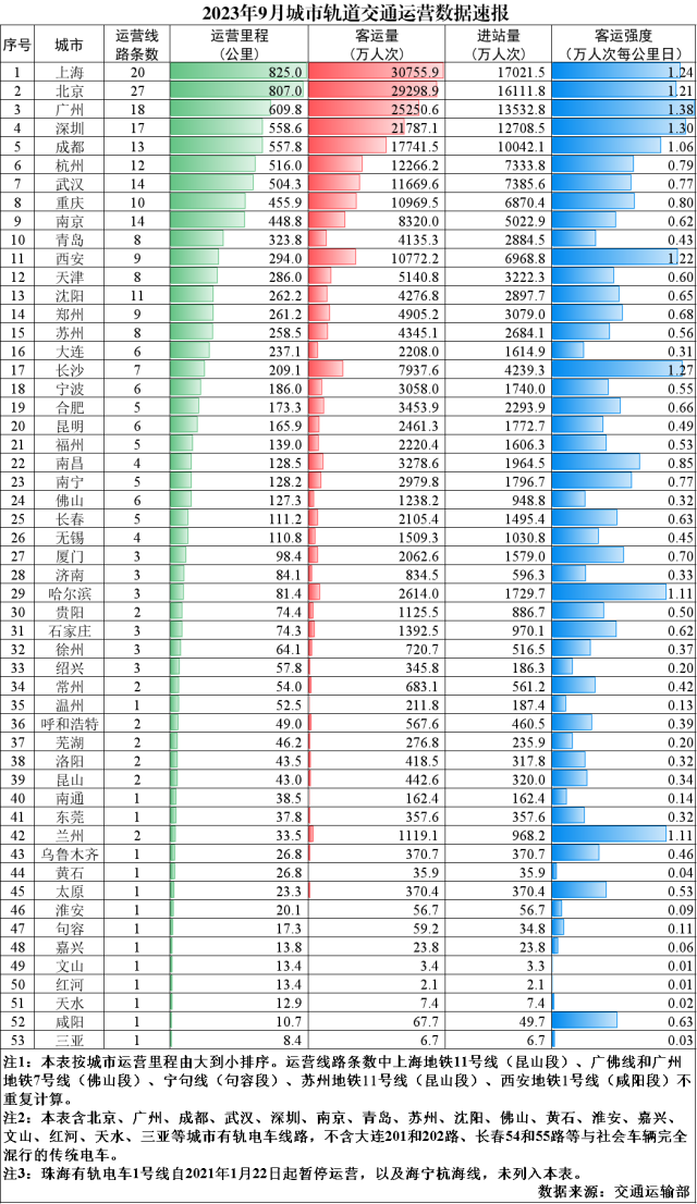 2023年9月,31個?。ㄗ灾螀^(qū)、直轄市)和新疆生產(chǎn)建設(shè)兵團(tuán)共有55個城市開通運(yùn)營城市軌道交通線路299條,運(yùn)營里程9859.5公里,實(shí)際開行列車318萬列次,完成客運(yùn)量24.9億人次,進(jìn)站量14.9億人次。9月份,客運(yùn)量環(huán)比減少2.2億人次、降低8.2%,同比增加7.1億人次、增長40%,較2019年月均客運(yùn)量增加5億人次、增長24.9%。9月份客運(yùn)強(qiáng)度平均水平為0.536萬人次每公里日,較2019年全年客運(yùn)強(qiáng)度平均水平降低1.8%。