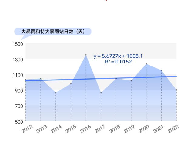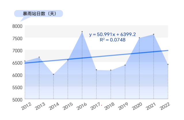 數(shù)據(jù)統(tǒng)計顯示,2012年至2022年,我國暴雨站日數(shù)有明顯的增加趨勢。這意味著,2012年到2022年,我國暴雨天氣過程的持續(xù)時間或影響范圍有增加(擴大)的趨勢。