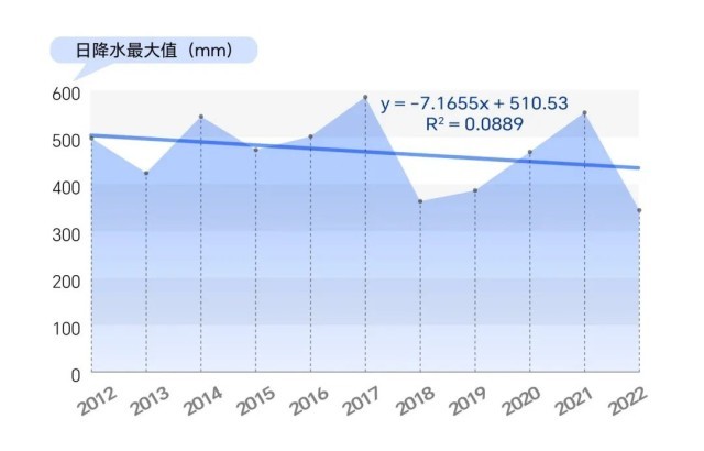 分析數(shù)據(jù)變化,可以看到,2012年到2022年我國日降水量最大值存在波動,總體有緩慢減少的趨勢。