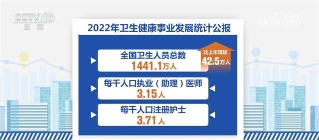 《公報(bào)》顯示,我國(guó)醫(yī)療衛(wèi)生資源總量繼續(xù)增加。到2022年末,全國(guó)醫(yī)療衛(wèi)生機(jī)構(gòu)達(dá)到1032918個(gè),比上年增加1983個(gè)。全國(guó)共設(shè)置13個(gè)類別的國(guó)家醫(yī)學(xué)中心和兒童類別的國(guó)家區(qū)域醫(yī)療中心。全國(guó)醫(yī)療衛(wèi)生機(jī)構(gòu)床位975.0萬(wàn)張,每千人口醫(yī)療衛(wèi)生機(jī)構(gòu)床位數(shù)由2021年的6.70張?jiān)黾拥?022年的6.92張。全國(guó)衛(wèi)生人員總數(shù)1441.1萬(wàn)人,比上年增加42.5萬(wàn)人。每千人口執(zhí)業(yè)(助理)醫(yī)師3.15人,每千人口注冊(cè)護(hù)士3.71人。