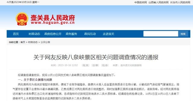 據(jù)壺關(guān)縣政府網(wǎng)站10月16日援引壺關(guān)縣文化和旅游局消息,經(jīng)調(diào)查組調(diào)查核實(shí),現(xiàn)將10月13日網(wǎng)友反映八泉峽景區(qū)相關(guān)問題調(diào)查情況通報(bào)如下: