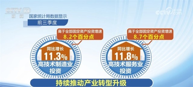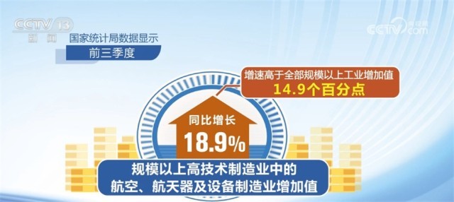 高技術(shù)產(chǎn)業(yè)投資動(dòng)力強(qiáng)勁,新動(dòng)能領(lǐng)域保持較快增長。國家統(tǒng)計(jì)局?jǐn)?shù)據(jù)顯示,前三季度,高技術(shù)制造業(yè)投資和高技術(shù)服務(wù)業(yè)投資分別同比增長11.3%和11.8%,分別高于全部固定資產(chǎn)投資增速8.2和8.7個(gè)百分點(diǎn),持續(xù)推動(dòng)產(chǎn)業(yè)轉(zhuǎn)型升級(jí)。規(guī)模以上高技術(shù)制造業(yè)中的航空、航天器及設(shè)備制造業(yè)增加值同比增長18.9%,增速高于全部規(guī)模以上工業(yè)增加值14.9個(gè)百分點(diǎn)。