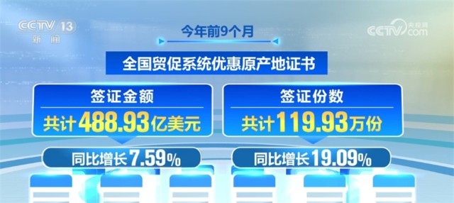 數(shù)據(jù)顯示,今年前9個月,全國貿促系統(tǒng)累計簽發(fā)原產地證書、ATA單證冊、商事證明書等各類證書455.06萬份,較上年同比增長13.39%。