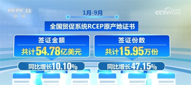 1月—9月,全國貿促系統(tǒng)RCEP原產地證書簽證金額共計54.78億美元,同比增長10.10%;簽證份數(shù)共計15.95萬份,同比增長47.15%。