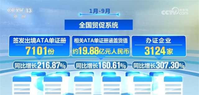 1月—9月,全國貿促系統(tǒng)共簽發(fā)出境ATA單證冊7101份,同比增長216.87%;相關ATA單證冊涵蓋貨值約19.88億元人民幣,同比增長160.61%;辦證企業(yè)3124家,同比增長307.30%。
