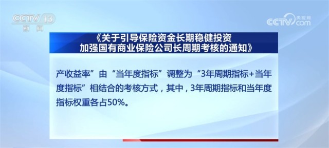 《通知》明確,為引導(dǎo)國有商業(yè)保險(xiǎn)公司長期穩(wěn)健經(jīng)營,更好發(fā)揮中長期資金的市場穩(wěn)定器和經(jīng)濟(jì)發(fā)展助推器作用,加強(qiáng)對國有商業(yè)保險(xiǎn)公司的長周期考核,根據(jù)《財(cái)政部關(guān)于印發(fā)<商業(yè)保險(xiǎn)公司績效評價(jià)辦法>的通知》,將經(jīng)營效益指標(biāo)的“凈資產(chǎn)收益率”由“當(dāng)年度指標(biāo)”調(diào)整為“3年周期指標(biāo)+當(dāng)年度指標(biāo)”相結(jié)合的考核方式,其中,3年周期指標(biāo)和當(dāng)年度指標(biāo)權(quán)重各占50%。