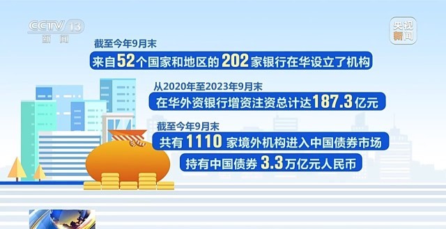 金融開放步伐加快。截至今年9月末,來(lái)自52個(gè)國(guó)家和地區(qū)的202家銀行在華設(shè)立了機(jī)構(gòu);從2020年至2023年9月末,在華外資銀行增資注資總計(jì)達(dá)187.3億元。截至今年9月末,共有1110家境外機(jī)構(gòu)進(jìn)入中國(guó)債券市場(chǎng),持有中國(guó)債券3.3萬(wàn)億元人民幣。