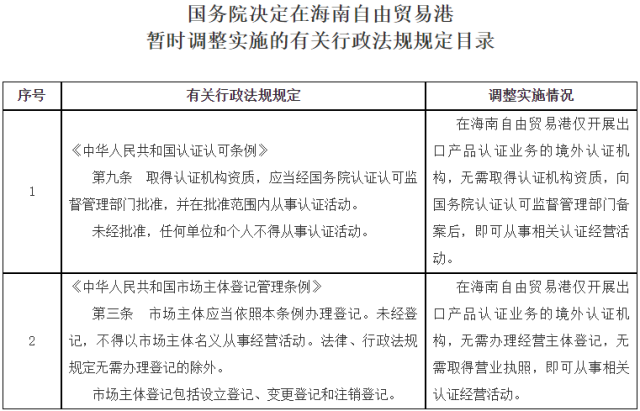 一、為支持海南自由貿(mào)易港建設(shè),按照《海南自由貿(mào)易港建設(shè)總體方案》,同意自即日起在海南自由貿(mào)易港暫時(shí)調(diào)整實(shí)施《中華人民共和國(guó)認(rèn)證認(rèn)可條例》《中華人民共和國(guó)市場(chǎng)主體登記管理?xiàng)l例》有關(guān)規(guī)定(目錄附后),在海南自由貿(mào)易港僅開(kāi)展出口產(chǎn)品認(rèn)證業(yè)務(wù)的境外認(rèn)證機(jī)構(gòu),無(wú)需取得認(rèn)證機(jī)構(gòu)資質(zhì)和辦理經(jīng)營(yíng)主體登記,向國(guó)務(wù)院認(rèn)證認(rèn)可監(jiān)督管理部門(mén)備案后,即可開(kāi)展出口產(chǎn)品認(rèn)證業(yè)務(wù),認(rèn)證結(jié)果僅限出口企業(yè)境外使用。備案條件和程序由國(guó)務(wù)院認(rèn)證認(rèn)可監(jiān)督管理部門(mén)制定。