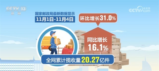 國(guó)家郵政局今天(11月5日)發(fā)布,快遞業(yè)從11月開始迎來業(yè)務(wù)旺季。最新數(shù)據(jù)顯示,11月1日至11月4日,全網(wǎng)累計(jì)攬收量20.27億件,同比增長(zhǎng)16.1%,環(huán)比增長(zhǎng)31.0%。今年快遞業(yè)務(wù)旺季從11月1日開始,到2024年春節(jié)前夕結(jié)束,時(shí)長(zhǎng)102天。
