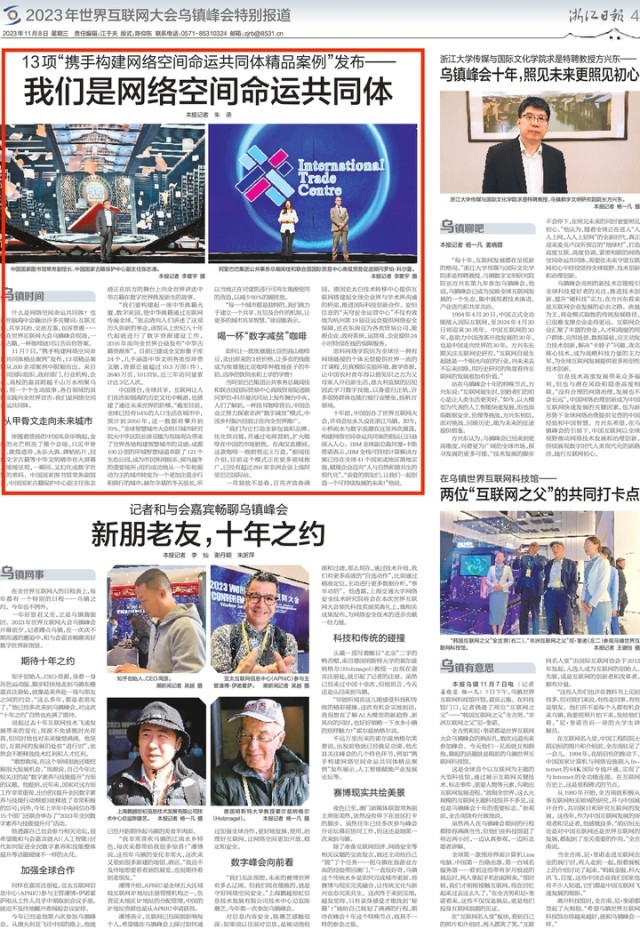 11月8日,《浙江日報》刊發(fā)《13項“攜手構建網(wǎng)絡空間命運共同體精品案例”發(fā)布——我們是網(wǎng)絡空間命運共同體》,全文如下: