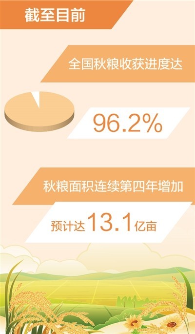 本報北京11月11日電 (記者郁靜嫻)農(nóng)業(yè)農(nóng)村部最新農(nóng)情調(diào)度顯示:伴隨玉米大豆及中稻收獲進入尾聲、南方晚稻收獲加速推進,全國秋糧收獲進度達96.2%,基本實現(xiàn)豐收到手。今年以來,我國糧食生產(chǎn)克服局部地區(qū)洪澇干旱等災(zāi)害影響,全年糧食產(chǎn)量有望再創(chuàng)新高。
