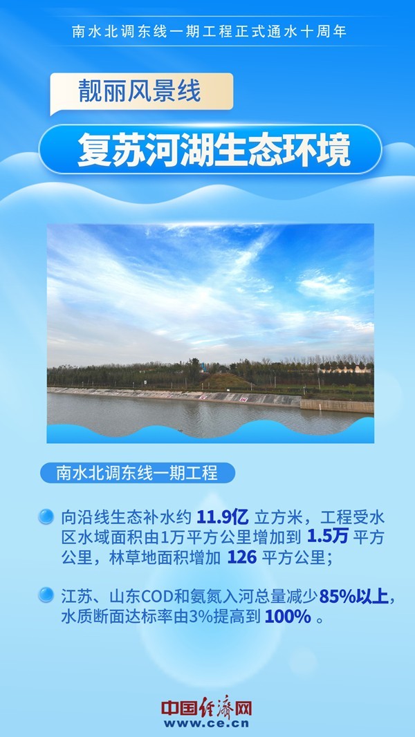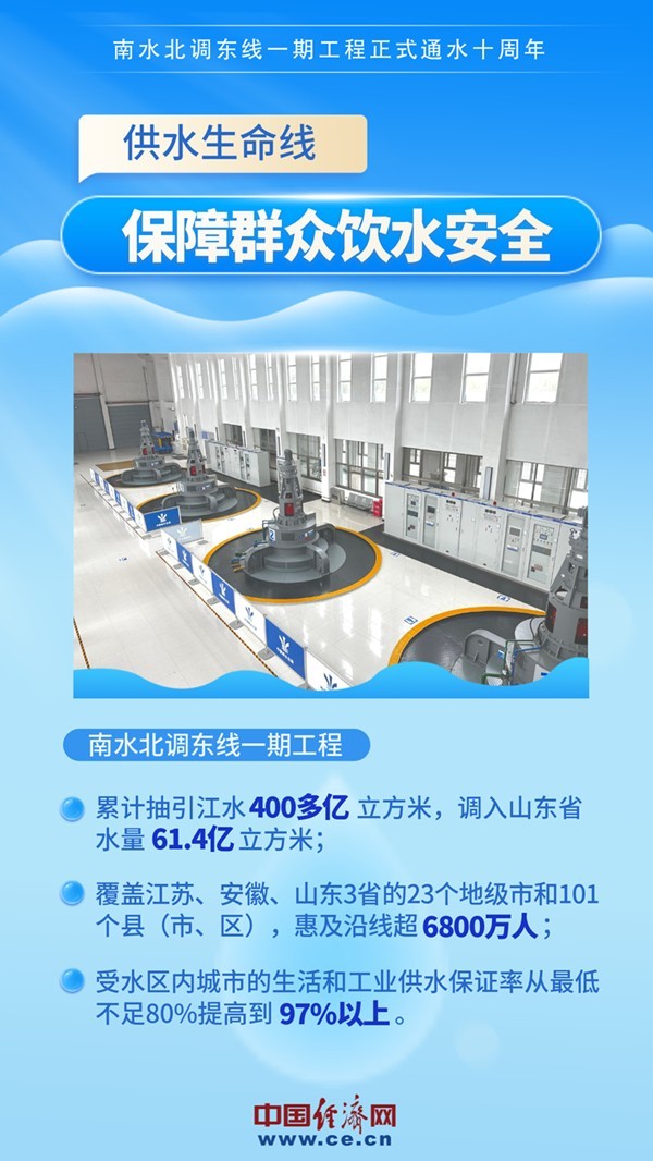 2013年11月15日,南水北調(diào)東線一期工程正式通水。通水10年來,東線一期工程累計抽引江水400多億立方米,調(diào)入山東省水量61.4億立方米,有效緩解了南水北調(diào)東線沿線受水區(qū)缺水問題,受益人口超6800萬人,成為優(yōu)化水資源配置、保障群眾飲水安全、復蘇河湖生態(tài)環(huán)境、暢通南北經(jīng)濟循環(huán)的生命線。