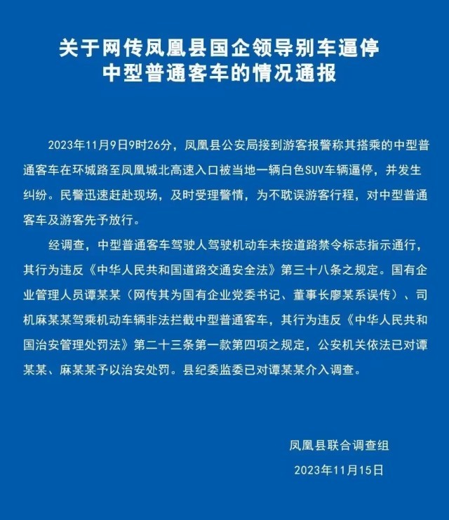 央視網(wǎng)消息:據(jù)鳳凰融媒微信公眾號消息,11月15日,鳳凰縣聯(lián)合調(diào)查組發(fā)布情況通報(bào),經(jīng)調(diào)查,中型普通客車駕駛?cè)笋{駛機(jī)動(dòng)車未按道路禁令標(biāo)志指示通行,其行為違反相關(guān)規(guī)定。國有企業(yè)管理人員譚某某 (網(wǎng)傳其為國有企業(yè)黨委書記、董事長廖某系誤傳)、司機(jī)麻某某駕乘機(jī)動(dòng)車輛非法攔截中型普通客車,其行為違反相關(guān)規(guī)定,公安機(jī)關(guān)依法已對譚某某、麻某某予以治安處罰??h紀(jì)委監(jiān)委已對譚某某介入調(diào)查。