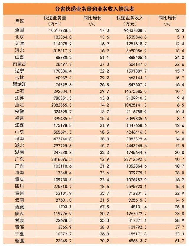 1-10月,東、中、西部地區(qū)快遞業(yè)務(wù)量比重分別為75.5%、16.5%和8.0%,業(yè)務(wù)收入比重分別為76.3%、14.0%和9.7%。與去年同期相比,東部地區(qū)快遞業(yè)務(wù)量比重下降1.4個百分點,快遞業(yè)務(wù)收入比重下降1.2個百分點;中部地區(qū)快遞業(yè)務(wù)量比重上升0.9個百分點,快遞業(yè)務(wù)收入比重上升0.6個百分點;西部地區(qū)快遞業(yè)務(wù)量比重上升0.5個百分點,快遞業(yè)務(wù)收入比重上升0.6個百分點。