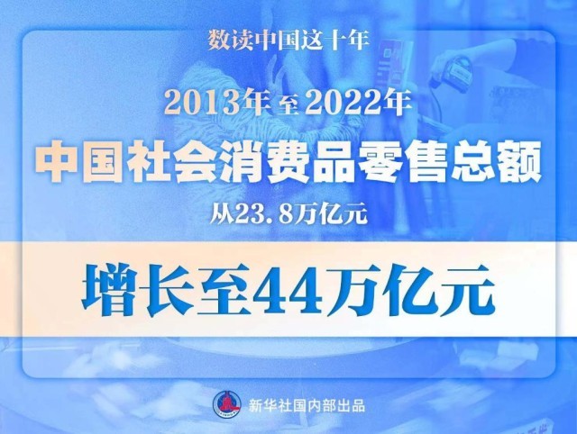 2013年至2022年10年間,中國社會(huì)消費(fèi)品零售總額從23.8萬億元增長至44萬億元,穩(wěn)居全球第二大消費(fèi)市場(chǎng)、第一大網(wǎng)絡(luò)零售市場(chǎng)和全球第二大進(jìn)口市場(chǎng)。消費(fèi)“主引擎”動(dòng)力強(qiáng)勁,為推動(dòng)高質(zhì)量發(fā)展、創(chuàng)造高品質(zhì)生活、構(gòu)建新發(fā)展格局提供有力支撐。