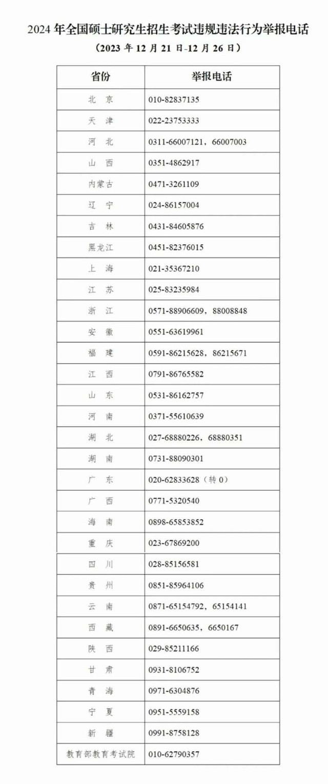 教育部和各?。▍^(qū)、市)教育招生考試機(jī)構(gòu)將開通2024年研考舉報(bào)電話,考生及社會(huì)各界人士可及時(shí)舉報(bào)反映有關(guān)問(wèn)題線索。教育部及各?。▍^(qū)、市)將會(huì)同有關(guān)部門根據(jù)舉報(bào)線索第一時(shí)間核查處理,堅(jiān)決維護(hù)風(fēng)清氣正的研考環(huán)境。