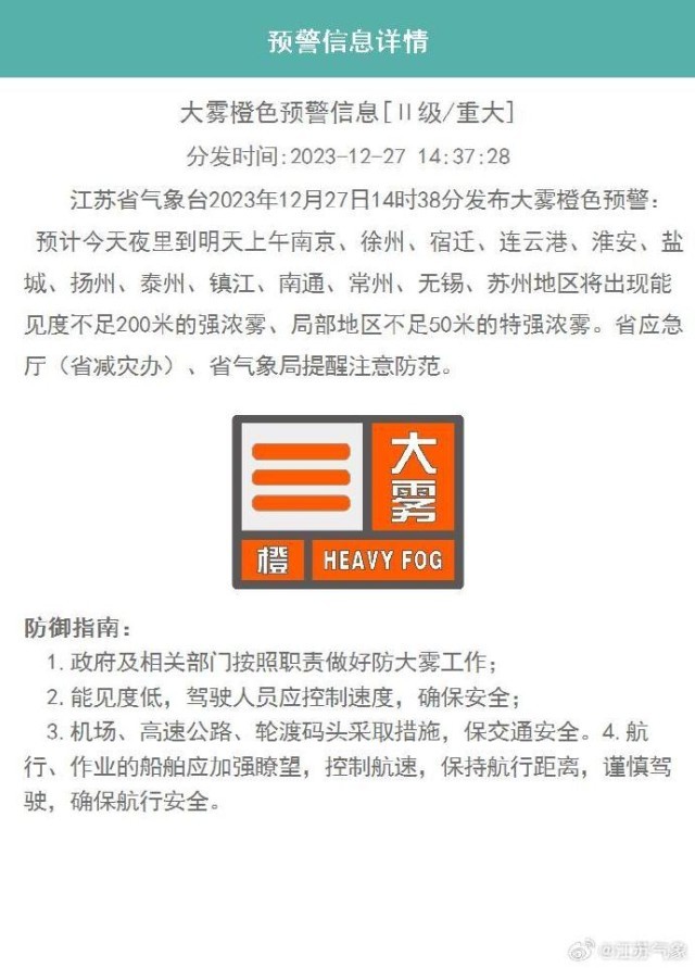 央視網(wǎng)消息:據(jù)@江蘇氣象 微博消息,江蘇省氣象臺(tái)2023年12月27日14時(shí)38分發(fā)布大霧橙色預(yù)警: 預(yù)計(jì)今天夜里到明天上午南京、徐州、宿遷、連云港、淮安、鹽城、揚(yáng)州、泰州、鎮(zhèn)江、南通、常州、無(wú)錫、蘇州地區(qū)將出現(xiàn)能見(jiàn)度不足200米的強(qiáng)濃霧、局部地區(qū)不足50米的特強(qiáng)濃霧。江蘇省應(yīng)急廳(省減災(zāi)辦)、省氣象局提醒注意防范。