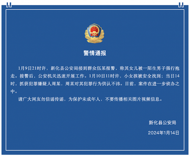 央視網(wǎng)消息:據(jù)“新化公安”公眾號消息,湖南新化縣公安局1月14日晚發(fā)布警情通報(bào),1月9日21時許,新化縣公安局接到群眾伍某報(bào)警,稱其女兒被一陌生男子強(qiáng)行抱走。接警后,公安機(jī)關(guān)迅速開展工作。1月10日11時許,小女孩被安全找到;當(dāng)日14時,抓獲犯罪嫌疑人周某,周某對其犯罪行為供認(rèn)不諱。目前,案件在進(jìn)一步偵辦之中。