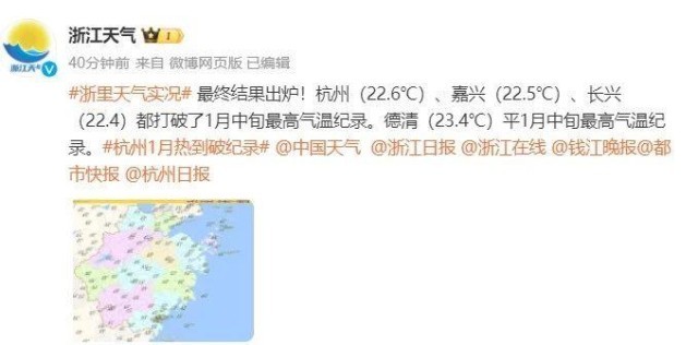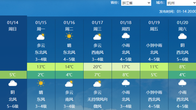 像是杭州,今天最高氣溫22.6℃,剛刷新當?shù)?月中旬最高氣溫紀錄,明天氣溫陡降,雖預報最高氣溫14℃,但今晚開始氣溫倒出,實際明天下午最高氣溫將不足10℃,17日氣溫再度升至20℃,大幅偏高,20日又降至8℃。