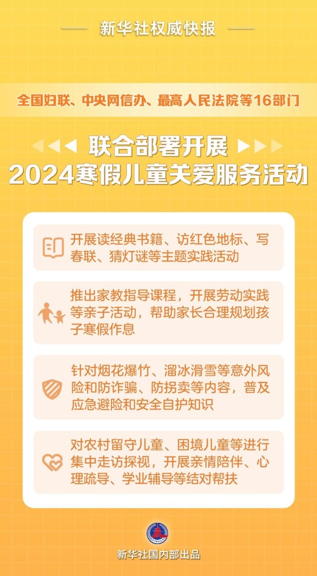寒假即將到來,全國(guó)婦聯(lián)、中央網(wǎng)信辦、最高人民法院、最高人民檢察院、教育部、公安部、民政部、司法部、國(guó)家衛(wèi)生健康委、應(yīng)急管理部、國(guó)家體育總局、國(guó)家疾控局、國(guó)家消防救援局、全國(guó)總工會(huì)、共青團(tuán)中央、中國(guó)關(guān)工委等16部門印發(fā)通知,圍繞思想引領(lǐng)潤(rùn)童心、家教指導(dǎo)育童心、安全教育護(hù)童心、愛心媽媽暖童心四個(gè)方面,聯(lián)合部署開展“把愛帶回家——真情暖童心 相伴護(hù)成長(zhǎng)”2024寒假兒童關(guān)愛服務(wù)活動(dòng)。