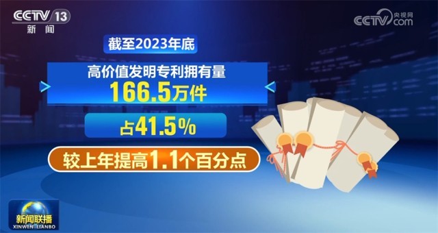 國務(wù)院新聞辦公室1月16日舉行新聞發(fā)布會,國家知識產(chǎn)權(quán)局相關(guān)負(fù)責(zé)人介紹,截至2023年底,我國國內(nèi)(不含港澳臺)發(fā)明專利有效量為401.5萬件,同比增長22.4%,首次超過400萬件。其中,高價值發(fā)明專利擁有量166.5萬件,占41.5%,較上年提高1.1個百分點。國內(nèi)企業(yè)擁有有效發(fā)明專利290.9萬件,占比增至71.2%,首次超過七成,創(chuàng)新主體地位進(jìn)一步凸顯。