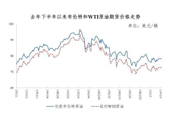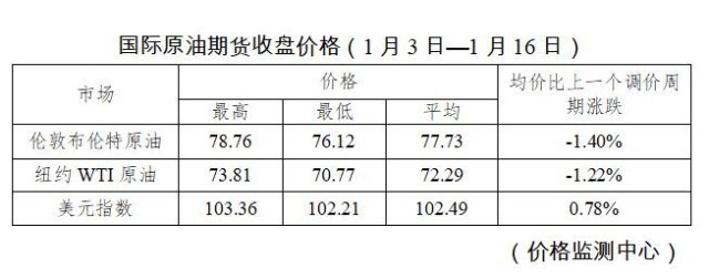 據(jù)國家發(fā)展改革委價格監(jiān)測中心監(jiān)測,本輪成品油調(diào)價周期內(nèi)(1月3日-1月16日)國際油價在震蕩中小幅下降。平均來看,倫敦布倫特、紐約WTI油價比上輪調(diào)價周期下跌1.31%。