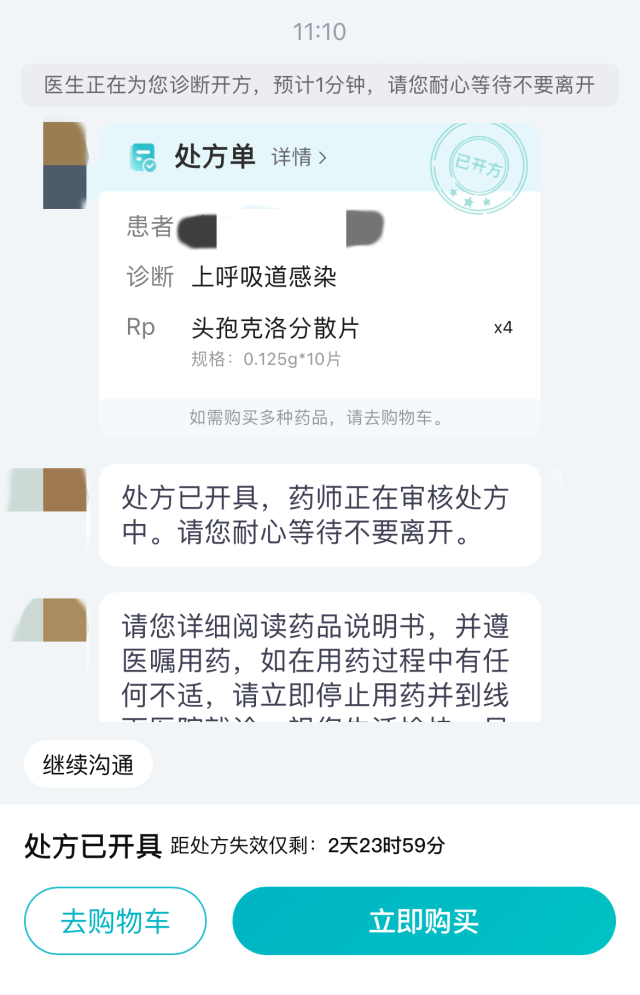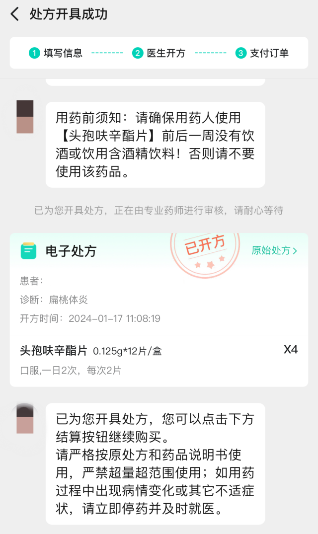 “您好,我是醫(yī)生XX,已收到您的復(fù)診開藥訴求,正在為您診斷開方,預(yù)計1分鐘,請不要離開……”自動發(fā)來三條問話后,記者并未回復(fù)任何信息,一份電子處方就順利開出。只需完成支付,處方藥就可以送貨上門。