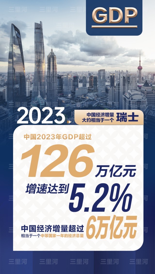 2023年中國經(jīng)濟年報顯示,全年GDP超過126萬億元(人民幣,下同),增速達到5.2%。按照可比價計算,2023年中國經(jīng)濟增量超過6萬億元,相當于一個中等國家一年的經(jīng)濟總量。