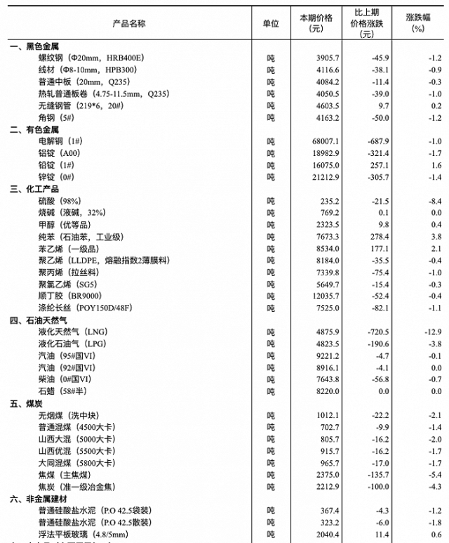央視網(wǎng)消息:國(guó)家統(tǒng)計(jì)局發(fā)布2024年1月中旬流通領(lǐng)域重要生產(chǎn)資料市場(chǎng)價(jià)格變動(dòng)情況,詳情如下: