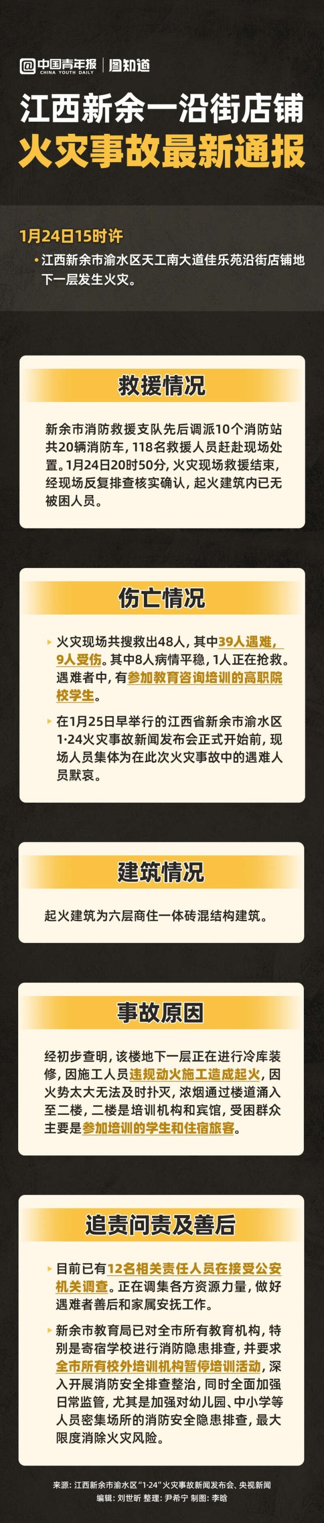 1月25日8時(shí),江西省新余市渝水區(qū)“1·24”火災(zāi)事故新聞發(fā)布會通報(bào),渝水區(qū)一沿街店鋪發(fā)生火災(zāi),造成39人遇難,9人受傷。遇難者中,有參加教育咨詢培訓(xùn)的高職院校學(xué)生。經(jīng)初步查明,事故原因系施工人員違規(guī)動火施工造成起火。目前,已有12名相關(guān)責(zé)任人員接受公安機(jī)關(guān)調(diào)查。此外,新余市要求全市所有校外培訓(xùn)機(jī)構(gòu)暫停培訓(xùn)活動,深入開展消防安全排查整治。