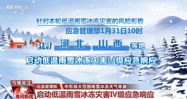 針對(duì)本輪低溫雨雪冰凍災(zāi)害的風(fēng)險(xiǎn)形勢(shì),應(yīng)急管理部1月31日10時(shí),針對(duì)河北、山西等地啟動(dòng)低溫雨雪冰凍災(zāi)害Ⅳ級(jí)應(yīng)急響應(yīng)。同時(shí),國家防災(zāi)減災(zāi)救災(zāi)委員會(huì)辦公室、應(yīng)急管理部等部門派出2個(gè)工作組分赴河南和湖北,協(xié)助指導(dǎo)低溫雨雪冰凍災(zāi)害防范應(yīng)對(duì)工作。中國氣象局1月31日上午啟動(dòng)重大氣象災(zāi)害(雨雪冰凍)Ⅲ級(jí)應(yīng)急響應(yīng)。