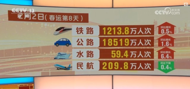 2024年綜合運(yùn)輸春運(yùn)工作專班數(shù)據(jù)顯示,春運(yùn)前8天,超15.5億人次出行。2月2日,也就是春運(yùn)第八天,全社會跨區(qū)域人員流動量超2億人次,為2024年春運(yùn)以來跨區(qū)域人員流動最多的一天。