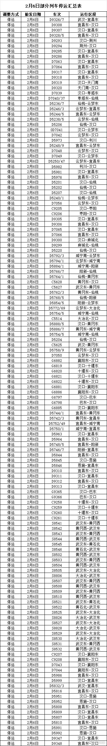 武漢鐵路局公告:2月6日武漢局管內(nèi)部分列車停運(yùn)