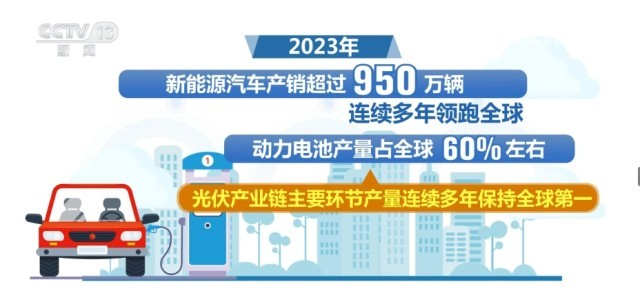 2023年,我國高技術制造業(yè)、裝備制造業(yè)增加值占規(guī)模以上工業(yè)增加值比重分別達到15.7%和33.6%。新能源汽車產銷超過950萬輛,連續(xù)多年領跑全球,動力電池產量占全球60%左右,光伏產業(yè)鏈主要環(huán)節(jié)產量連續(xù)多年保持全球第一。