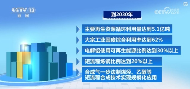 《指導意見》提出,到2030年,主要再生資源循環(huán)利用量達到5.1億噸,大宗工業(yè)固廢綜合利用率達到62%,電解鋁使用可再生能源比例達到30%以上,短流程煉鋼比例達到20%以上,合成氣一步法制烯烴、乙醇等短流程合成技術實現(xiàn)規(guī)?;瘧?。