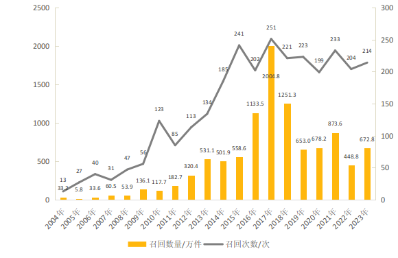 圖1 2004—2023年汽車(chē)產(chǎn)品召回的次數(shù)與數(shù)量
