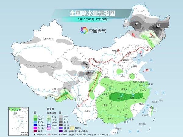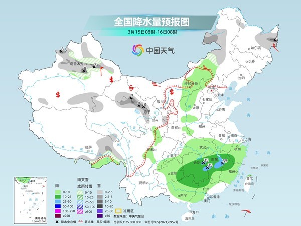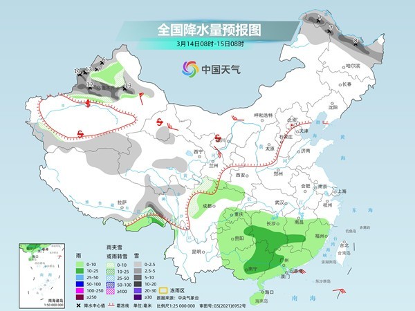 明天,內(nèi)蒙古中東部、黑龍江東北部、新疆沿天山地區(qū)、西藏南部和東部、青海北部、甘肅河西、寧夏南部等地部分地區(qū)有小到中雪或雨夾雪,其中,黑龍江東北部、新疆沿天山地區(qū)、青海北部和東部等地部分地區(qū)有大雪(5~8毫米)。陜西北部、山西北部、江漢大部、江南、華南大部等地部分地區(qū)有小到中雨,其中,湖南東部、江西中北部等地部分地區(qū)有大雨(25~35毫米)。
