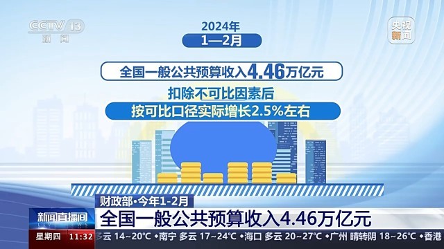 財(cái)政部副部長(zhǎng)廖岷介紹,今年1—2月,全國(guó)一般公共預(yù)算收入4.46萬(wàn)億元,扣除不可比因素后,按可比口徑實(shí)際增長(zhǎng)2.5%左右,保持恢復(fù)性增長(zhǎng),與宏觀經(jīng)濟(jì)穩(wěn)中向好的態(tài)勢(shì)基本保持一致;全國(guó)一般公共預(yù)算支出同比增長(zhǎng)6.7%,完成全年預(yù)算的15.3%,支出進(jìn)度為近5年同期最快。