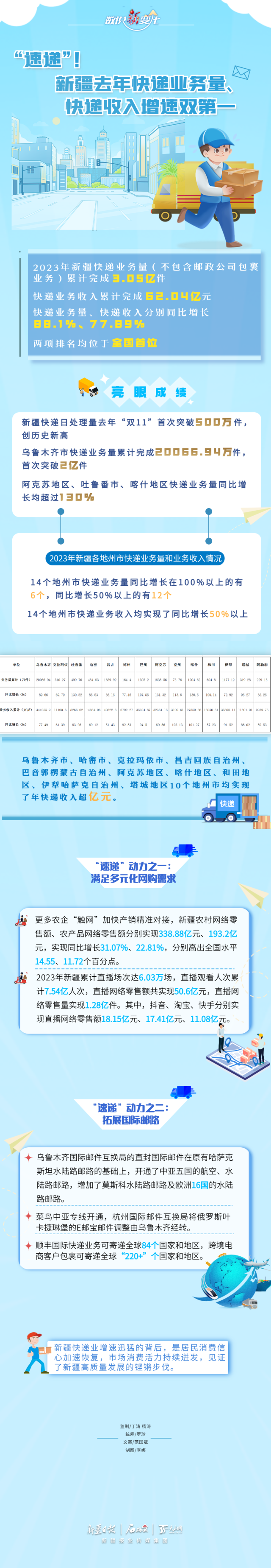近日,國家郵政局公布2023年郵政行業(yè)運行情況,從快遞業(yè)務(wù)量和收入的增速指標看,新疆排名均位于全國首位。快遞是反映經(jīng)濟活力的“晴雨表”,全疆各地取得哪些成績?快遞業(yè)增速迅猛的背后有哪些原因?今天的《數(shù)說“新”變化》帶你感受新疆“速遞”!