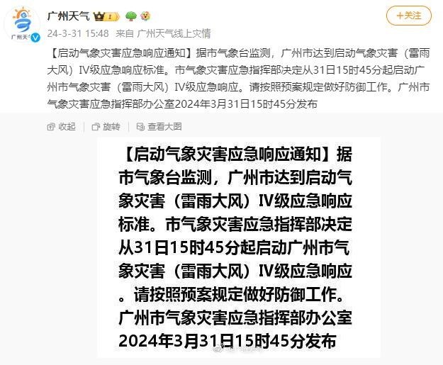 央視網(wǎng)消息:據(jù)廣州天氣 消息,據(jù)廣州市氣象臺監(jiān)測,廣州市達到啟動氣象災害(雷雨大風)Ⅳ級應急響應標準。市氣象災害應急指揮部決定從31日15時45分起啟動廣州市氣象災害(雷雨大風)Ⅳ級應急響應。請按照預案規(guī)定做好防御工作。